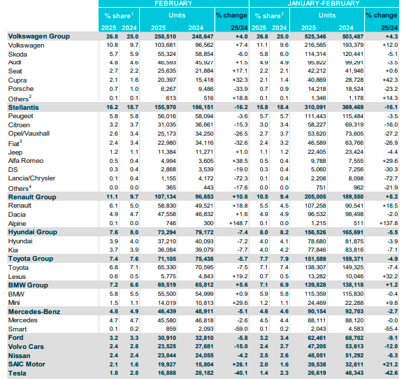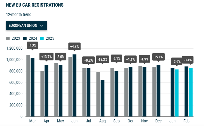 根据欧洲汽车制造商协会发布的数据,由于经济不确定性,消费者抑制购买大件商品,2月份欧洲汽车总销量最大减少5个月——新车注册量较去年同期减少3.1%至963540辆。