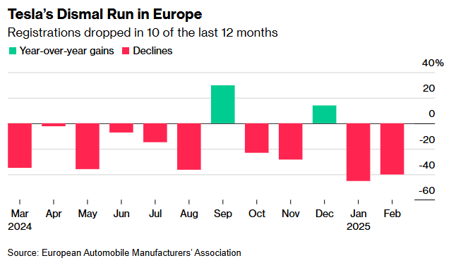 特斯拉3月和未来几个月的新车注册数据将使投资者更清楚地了解特斯拉在欧洲销量下滑中围绕马斯克的政治因素扮演了多大的角色。从目前的趋势来看,情况可能只会越来越糟...