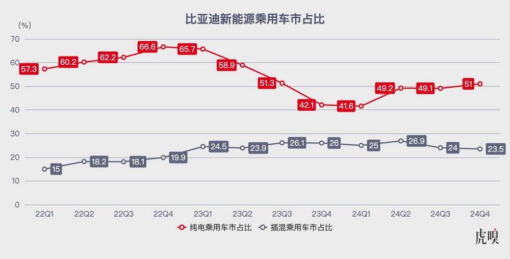 第二个是“非常E平台”,在这次新技术发布之前,比亚迪的纯电技术一直停留在2022年的“E3”.0 EVO“平台充电效率更慢,续航体验更差,对比亚迪纯电产品的销量影响很大,2024年第四季度比亚迪纯电产品市场份额与混合动力产品市场份额相差117%。