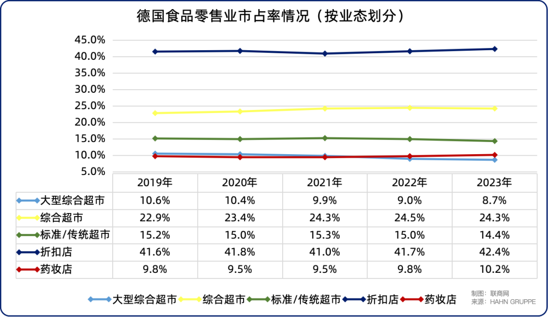 同时,根据德国零售研究所的说法(EHI Retail Institute)调查显示,在这个经过百年发展的完善零售体系中,呈现出两个鲜明的趋势:一方面,虽然传统大卖场通过不断改造升级积极适应新的消费需求,但其市场份额仍呈现结构性下降;另一方面,以硬折扣店和药店为主的小型专业零售业态,不但长期占据市场主导地位,而且保持稳定的年均增长率。