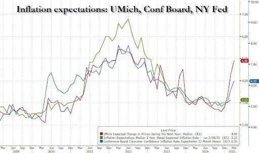 除了股票市场,客户对未来通货膨胀的预期也在上升。12 月度通胀预期来自 2 月份的 5.8% 上升到 3 月份的 因为顾客仍然担心鸡蛋、肉类等关键家庭必需品的高价格和关税的影响,所以6.2%。