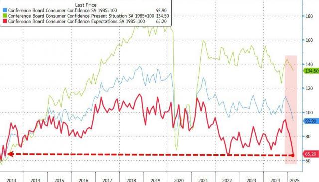 值得注意的是,预期指数在未来六个月大幅下跌至 65.2,创近12年新低,远低于12年, 80 这个关键的分界点,往往意味着美国经济将陷入衰退,表明消费者对未来经济形势的悲观情绪日益加剧。