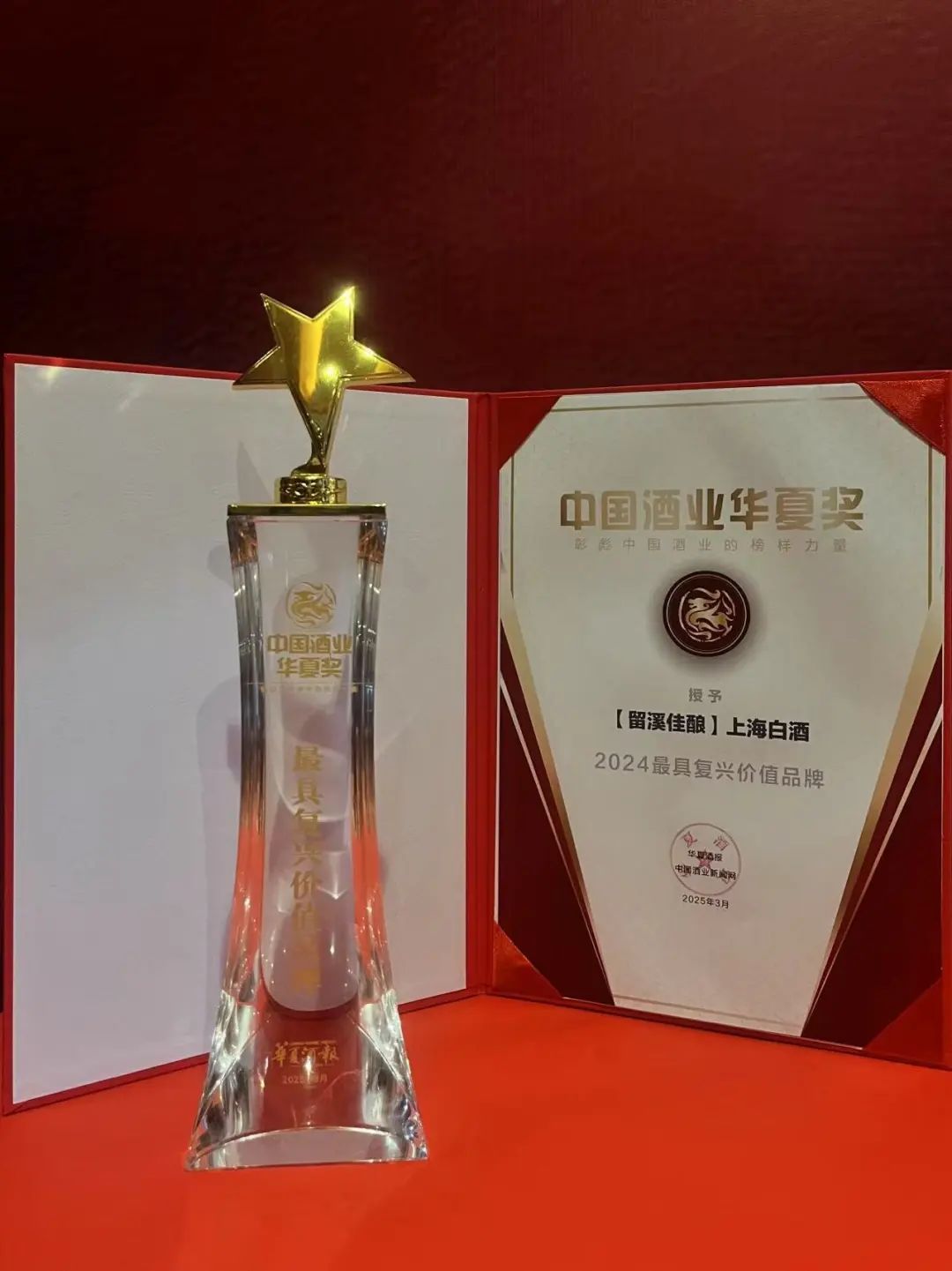 3月24日下午,由华夏酒报、中国酒业新闻网主办的2025年“中国酒业华夏奖”颁奖典礼在成都名人酒店隆重开幕。其中,上海留溪佳酿酒有限公司推出的“留溪佳酿”上海白酒荣获中国酒业华夏奖最具振兴价值品牌。