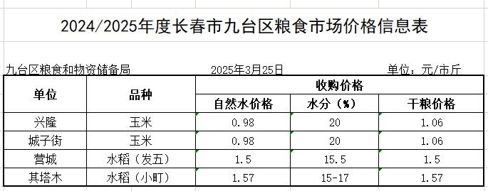 2025年3月25日,辖区内部分乡镇(街道)粮食收购公司玉米、水稻收购价格如下: