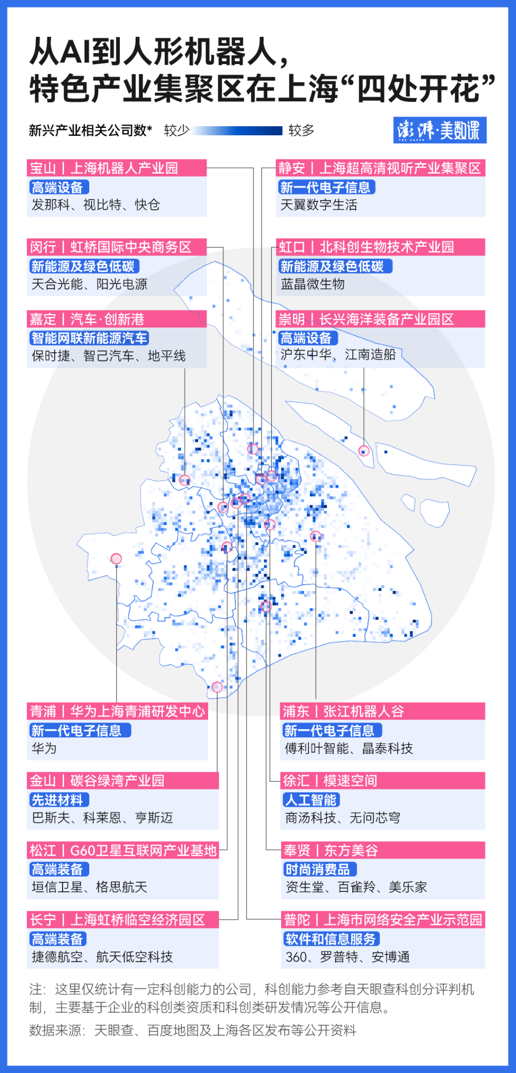 本报通过天眼查公司科技能力处理数据,将这14个集聚区映射到上海科技企业热图上,发现很多都有成熟的产业生态,有自己的产业基础和资源优势。