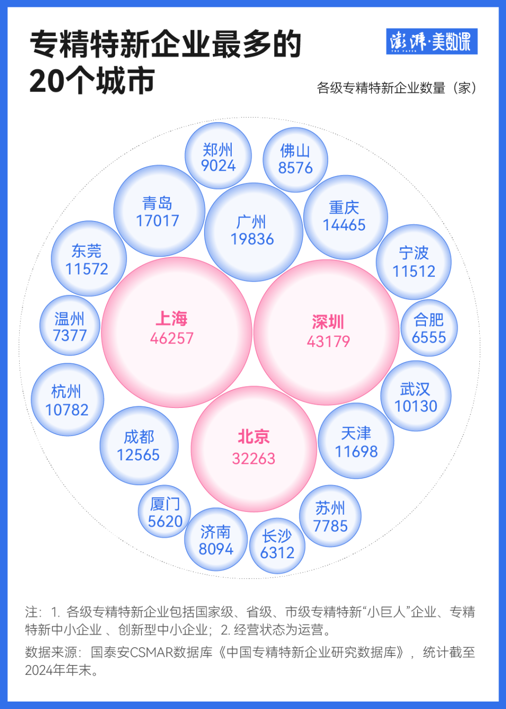 该报在整理《中国专业特新企业研究数据库》时发现,上海有46000家专业特新“小巨人”公司、专业特新中小企业或创新中小企业,超过其他一线城市。