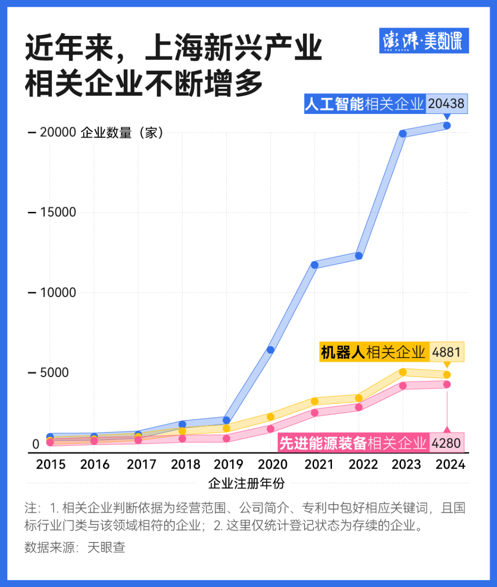 正是这样的产业政策,让专注于人工智能等新兴产业的公司不断涌现在上海。根据第三方平台记录的公司注册数据,2024年,上海增加了2万多家人工智能相关企业。