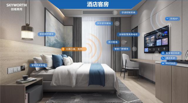 通过打通电视和客房控制系统,创维自研全天。 AI 技术语音助理可以让客人直接通过 AI 声音可以实现整个房间的场景交互,只需在床上就可以轻松控制灯光方式、空调、电视开关、场景模式等方便服务。