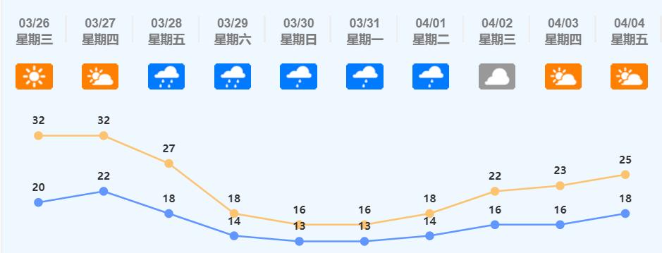 三月二十六日至二十七日,广东的最高温度仍然超过30°C,预计28日(周五)强冷空气到达,27-28日广东从北向南转雷,29日至4月初持续阴雨寒性。(来源:佛山天气)