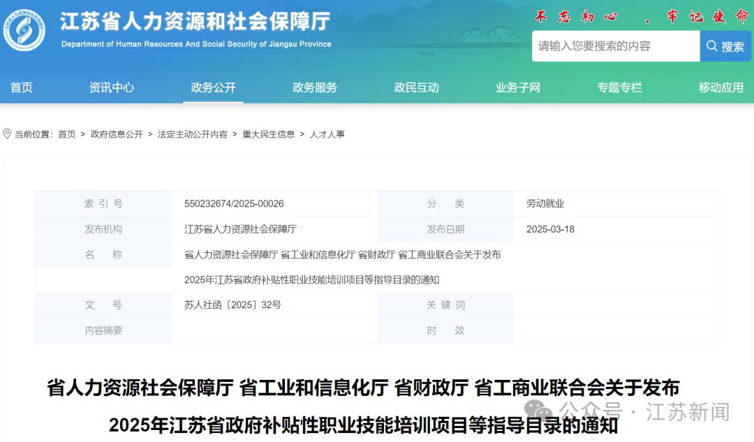 近日,江苏省人力资源和社会保障厅、省工业和信息化厅、省财政厅、省工商联集中公布了2025年全省政府补贴职业技术培训项目指导目录,包括11个职业资格证书培训补贴项目、518个职业技能等级证书培训补贴项目、123个专项职业能力培训补贴项目。