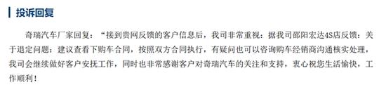其次,厂商和经销商之间的责任推卸现象普遍存在。奇瑞官方在多次投诉中只回复“按合同执行”,并没有实质性约束经销商的行为。