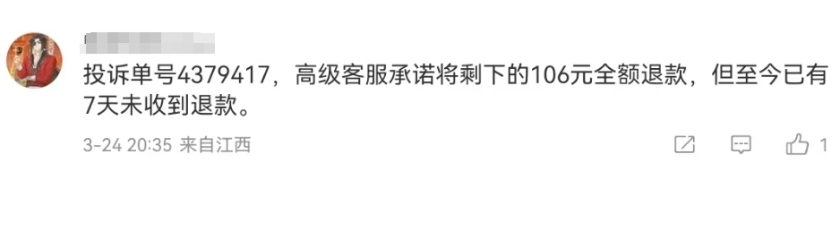 然而,仍然有大量消费者反馈说他们没有收到退款或问题没有解决。在微博上,ThePaper发现有消费者留言:“投诉订单没有处理,谁相信自己说的话?”该客户表示,其15日至20日的投诉没有处理,多次催促仍未处理问题。此外,有消费者反映“投诉已经处理,高级客服承诺退款,但至今已有7天未收到退款”。