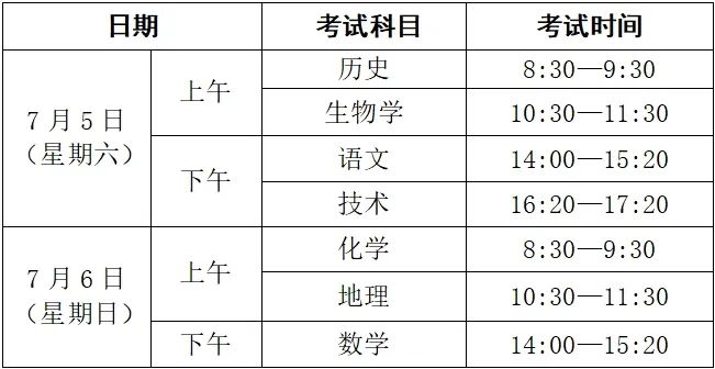 高一学生报考历史、地理、化学、生物学;高二学生报考语文、数学、技术等科目。考试时间如下: