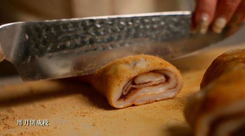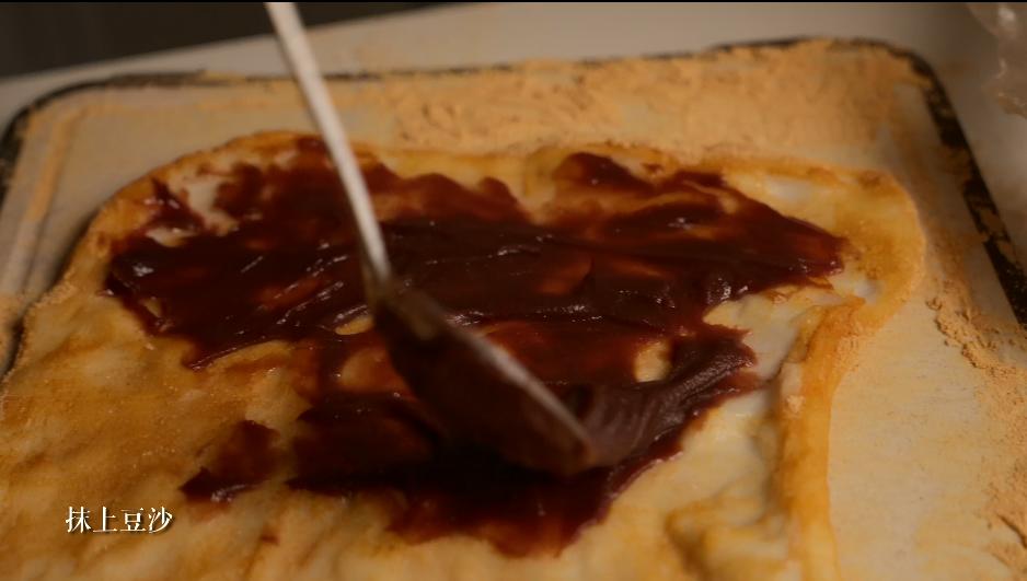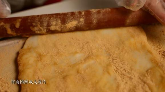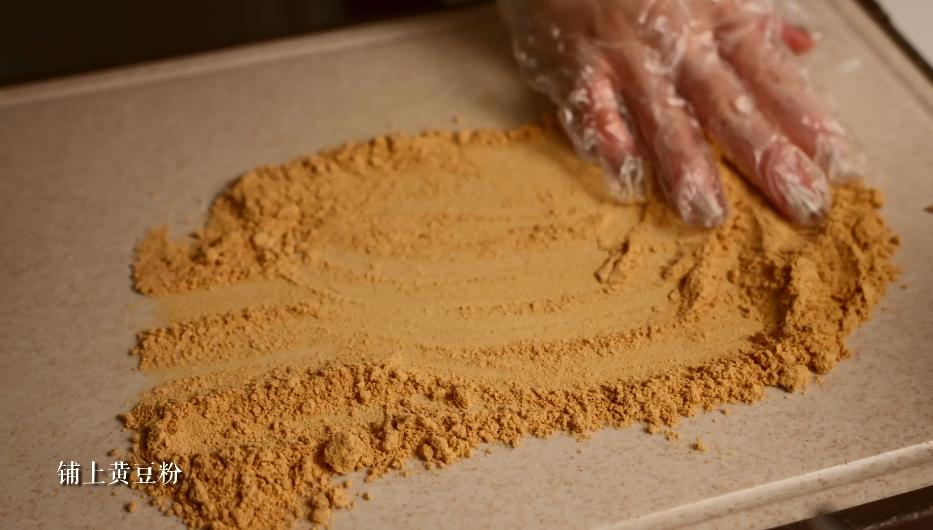 将黄豆粉铺在砧板上,将面团擀成大片,均匀涂上黄豆粉。