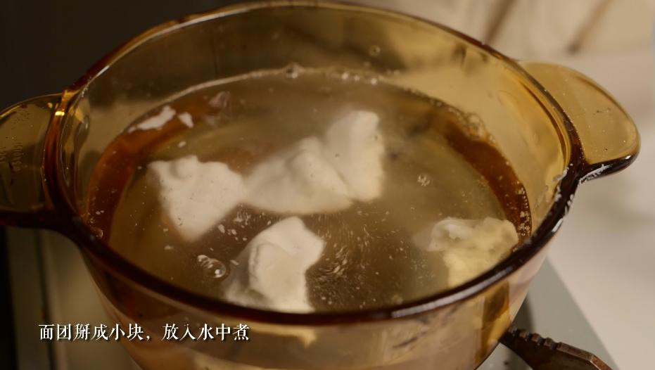将面团掰成小块,放入水中煮沸,煮至面团漂浮5分钟。