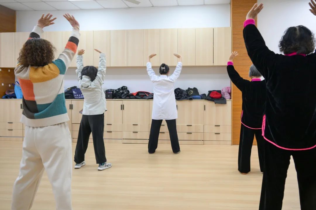 八段锦兴趣组组长张琴飞特别高兴专业指导的到来:“以前我们跟着视频自学,很多细节都不确定。现在有中医手把手教,呼吸节奏规范。团队也从最初的10个人发展到20多个人,包括五六个年轻人,每个人都很情绪化。”