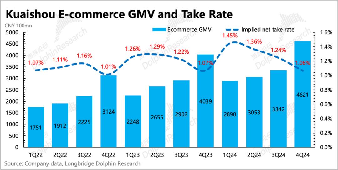 第四季度电子商务收入同比增长14%,预计将继续放缓。拆分方面,GMV 4621亿,同比增长14%,佣金率1.06%,同比下降。