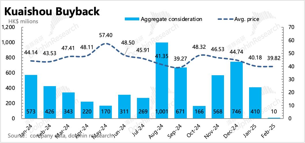 6. 股东回购尚未提高:与第三季度相比,第四季度整体市值有所上升,快手放缓了回购,耗资近15亿港元,回购了3200万股公司股票。