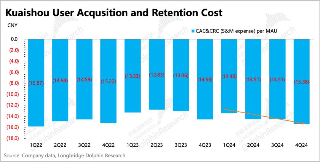 但是海豚君会谨慎乐观地看待这一预期差异。,从我们计算的应用指标-客户获得 从维护成本来看,第四季度再次同比上升。说明即使流量稳步扩大,在当期月活增加的背后,企业的广告成本更高。 内容投入。因此,就商业效率而言,存在边际下降。