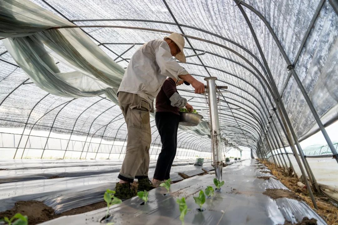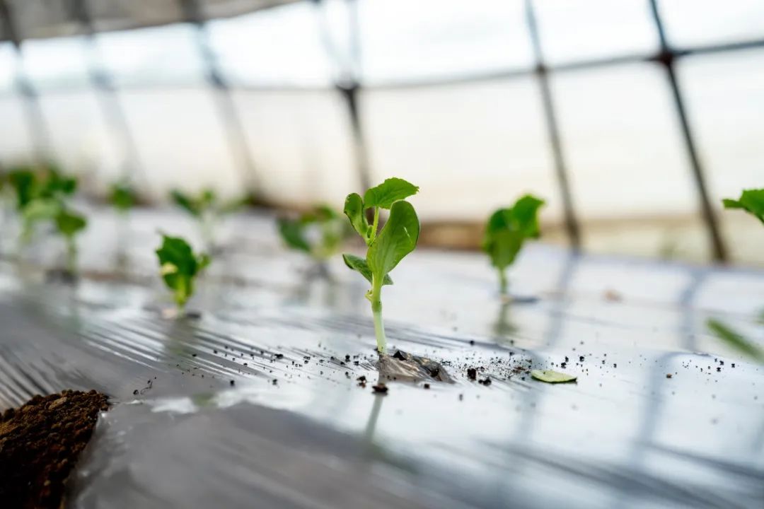 温室里的工人弯下腰,准确地将绿色的黄瓜苗种植在覆盖着地膜的田垄中。幼苗成行,填土、压实、滴灌一气呵成,绿色的幼苗矩阵逐渐形成。这种与季节同频的“播种交响曲”,为盛夏的丰收埋下了动人的悬念。