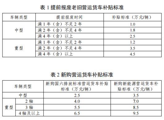 其中,购买国家六大排放标准运输卡车或新能源运输卡车补贴标准见表2。报废旧运输卡车提前报废不到一年的,可以申请运输卡车补贴。
