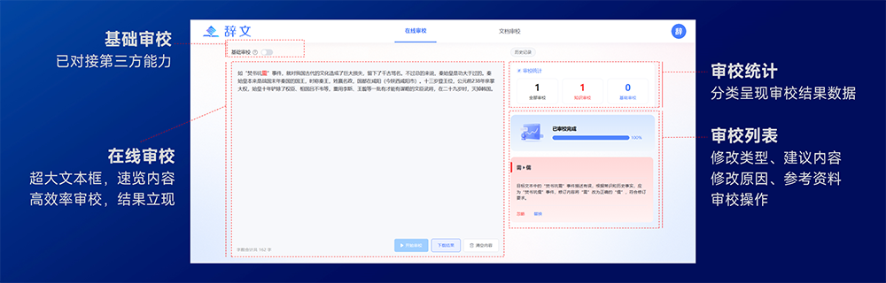 “辞文”作为中国第一个结合权威工具书资源智能审校的解决方案,完成了四大技术突破:一是准确的知识追溯能力。当发现错误时,系统不仅可以指出问题,还可以通过Agent技术准确定位大辞海的相关内容,展示完整的知识链,让用户不仅知道“错在哪里”,还能更好地理解“什么是正确的”;第二,强大的多轮推理能力,可以深入验证文本的多维合理性,找出隐藏的逻辑谬误。例如,当审批一篇关于历史人物的文章时,系统不仅仅是一个简单的验证时代,而是通过多重推理来验证人物、时代背景、事件顺序等多个维度的合理性。第三,动态知识更新机制,确保验证结果跟上学术发展的前沿。当大辞海数据库更新时,系统可以自动同步知识;第四,通过有效控制大模型的发散和幻觉问题,智能互动审校流程提供了个性化的审校建议。这种人机合作方式不仅保留了人工审校的专业判断,而且充分发挥了AI的效率优势。
