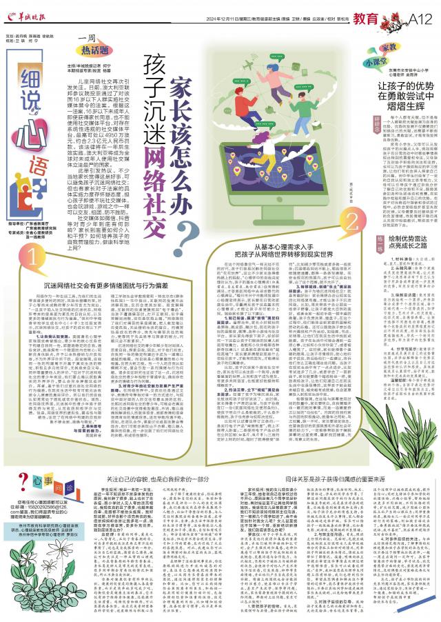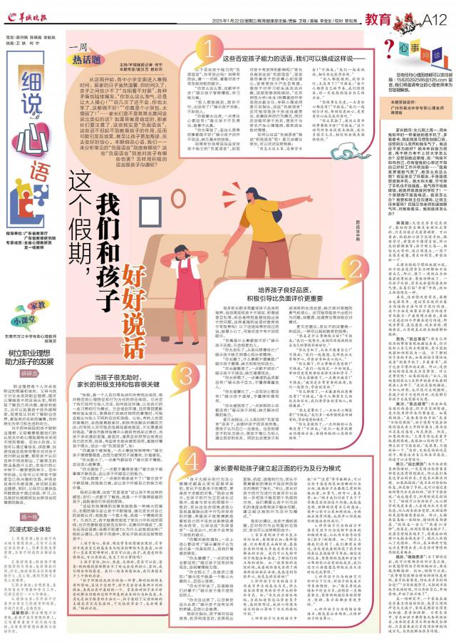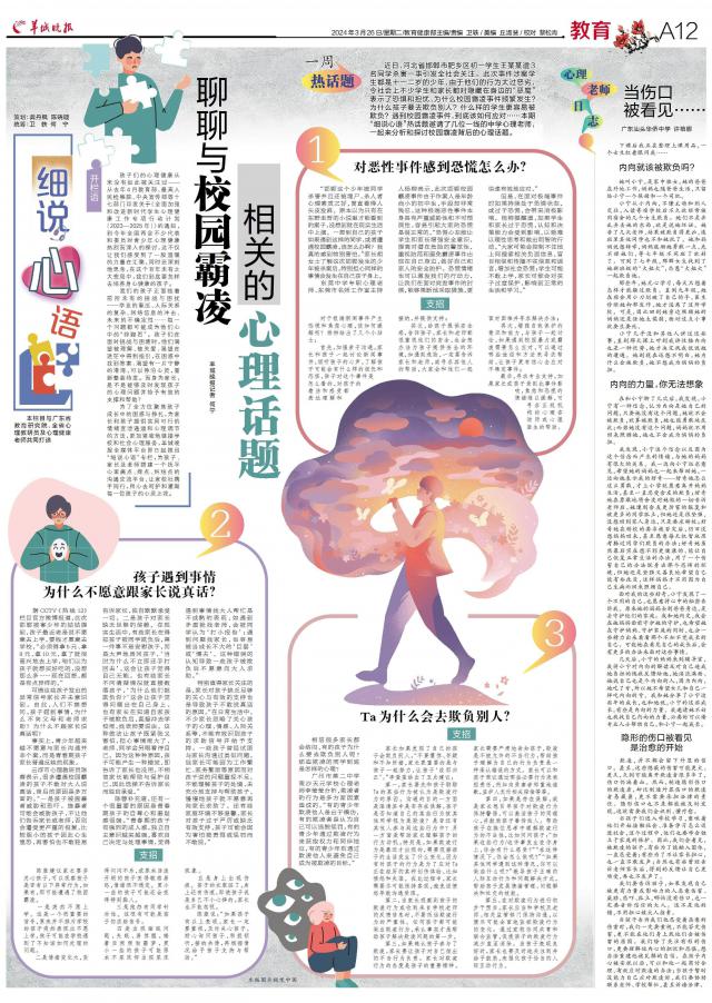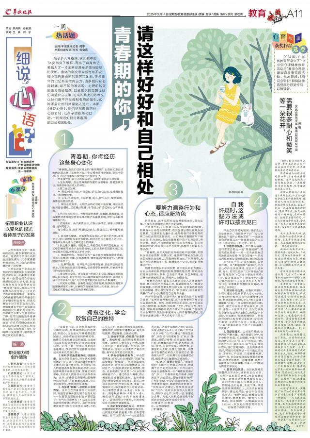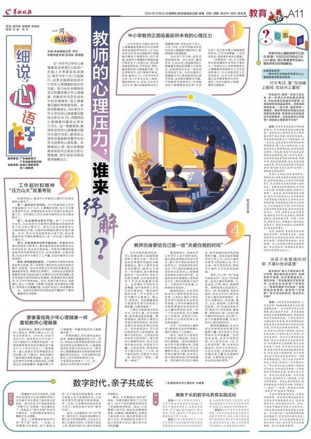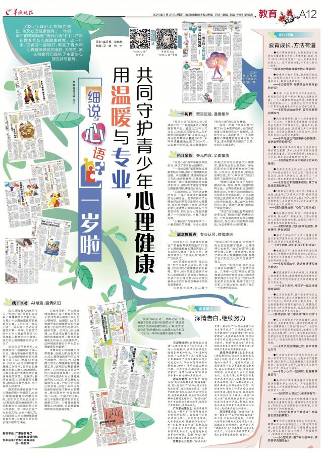 2025 2008年,政府工作报告提出普及心理健康教育。一年前诞生的《羊城晚报》“细说心语”频道正在普及心理健康教育。在过去的一年里,它像一盏明灯,照亮了青少年心理健康教学的道路,为学生、家长和老师提供了大量的心理支持和指导。