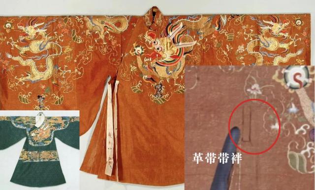 当然而且不只是红色,比如孔府旧藏的另一件蟒袍,是立领斜襟款式,是香色;而且还有深绿色,如左下图所示,这是传统的领取款式;而且作为蟒袍,一般都是带皮带的,有些蟒袍还有带皮带的,和我们现代的风衣带差不多。