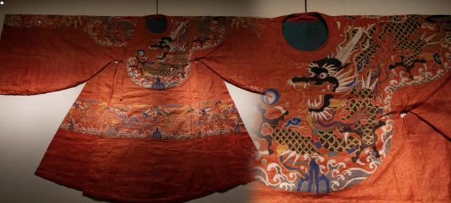 "蟒袍"男女皆可穿,作为明代赐服吉服,相当于一品。这件藏在孔子博物馆的红色化妆纱云肩通袖蟒袍,是当代很多蟒袍的参考形式。可以看出,像龙一样的蟒蛇,有四只爪子,形象也很威武。这款鲜红的圆领袍款式,也常被用作吉服的代表。在洪武时期,礼部官员搬出了服色五德论,认为明朝属于火德,应尚赤。在某些场合,明朝将对穿红色的服装提出重要要求。