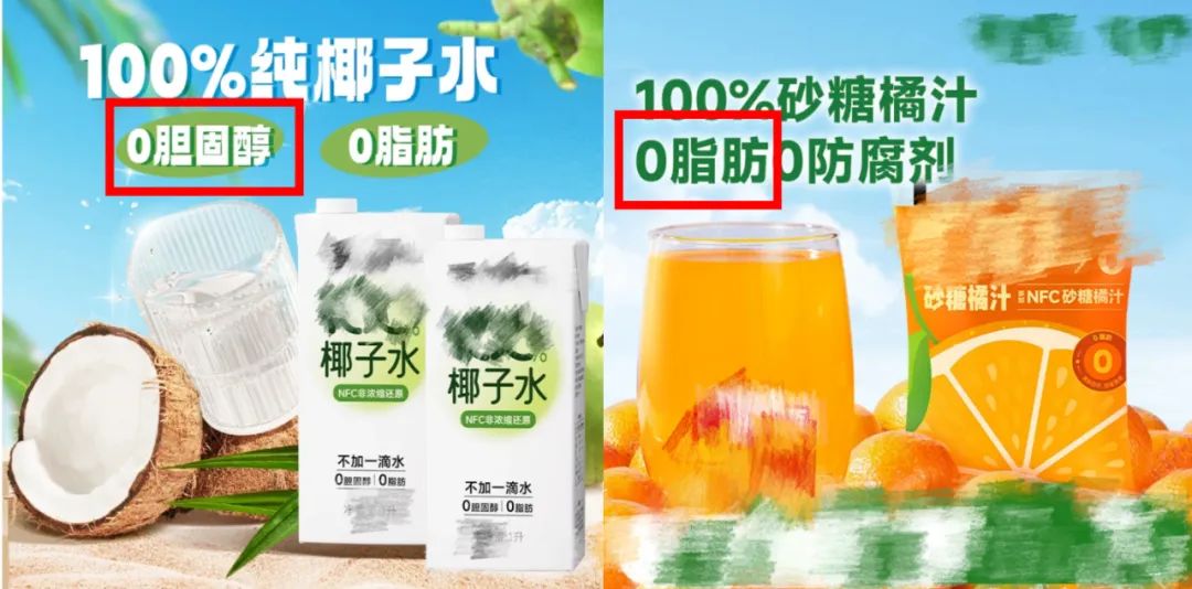 同样的卧龙凤雏,还有标记。「0脂肪」的果汁,「0香精」的香菇干,「0胆固醇」的椰子水。