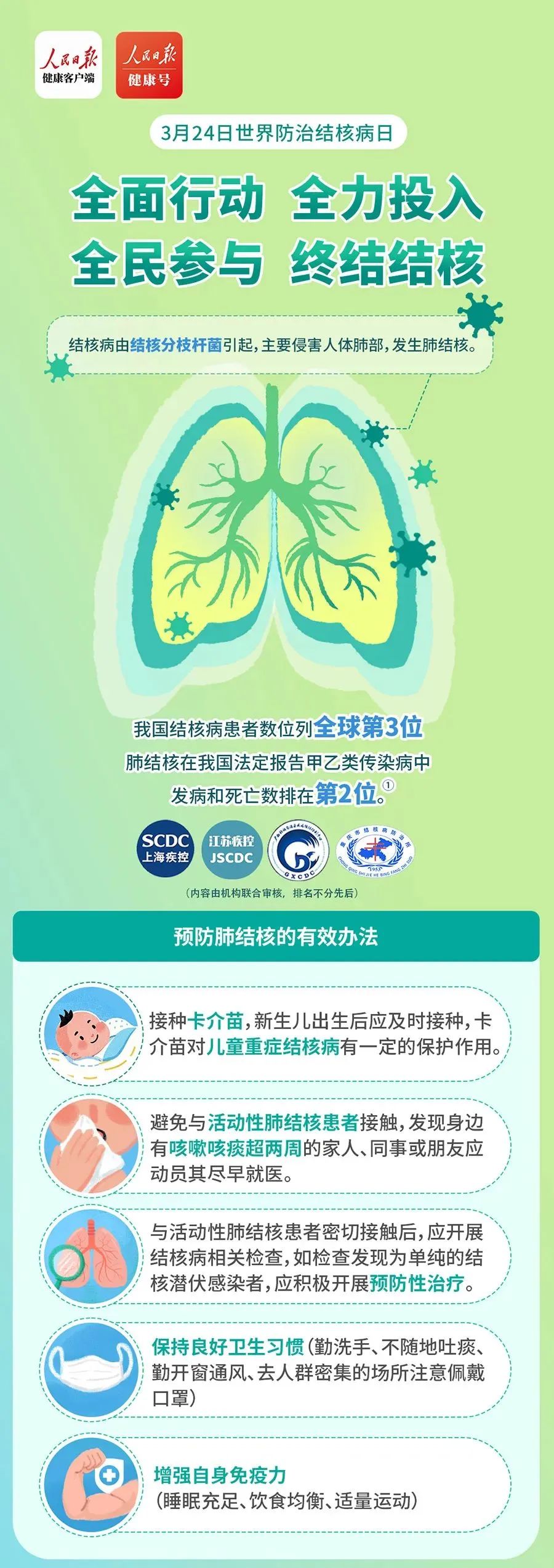 《人民日报》健康客户端联合上海市疾病预防控制中心、江苏省疾病预防控制中心、广西壮族自治区疾病预防控制中心、重庆市结核病预防控制中心,推出世界结核病预防控制日科普海报,帮助公众了解结核病,帮助全体员工提高结核病预防控制素养。