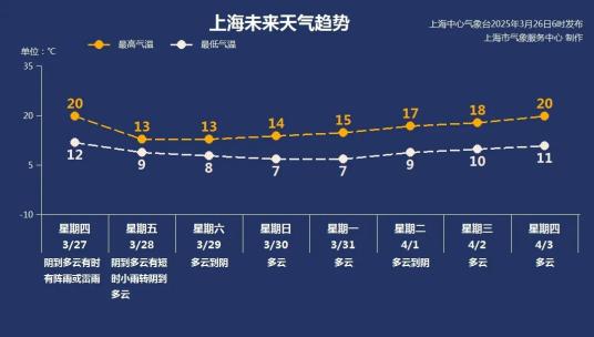 三月二十七日(星期四):阴天有时会有阵雨或雷雨,12~20℃