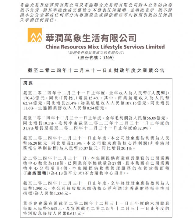 乐居财经 赵盼盼 3 月 26 日前,华润万象生活有限公司发布截止日期 2024 年 12 月 31 财政年度日止业绩公告。