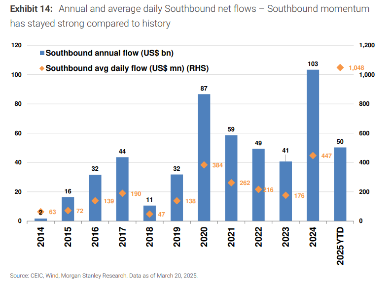 朝南资金已经成为香港股市的稳定支撑力量。2024年年净流入记录超过1000亿美元,2025年以来势头更强,不到三个月就实现了500亿美元的净流入,日均净流入达到10亿美元,是2024年记录的两倍多。