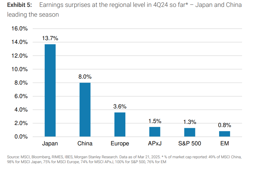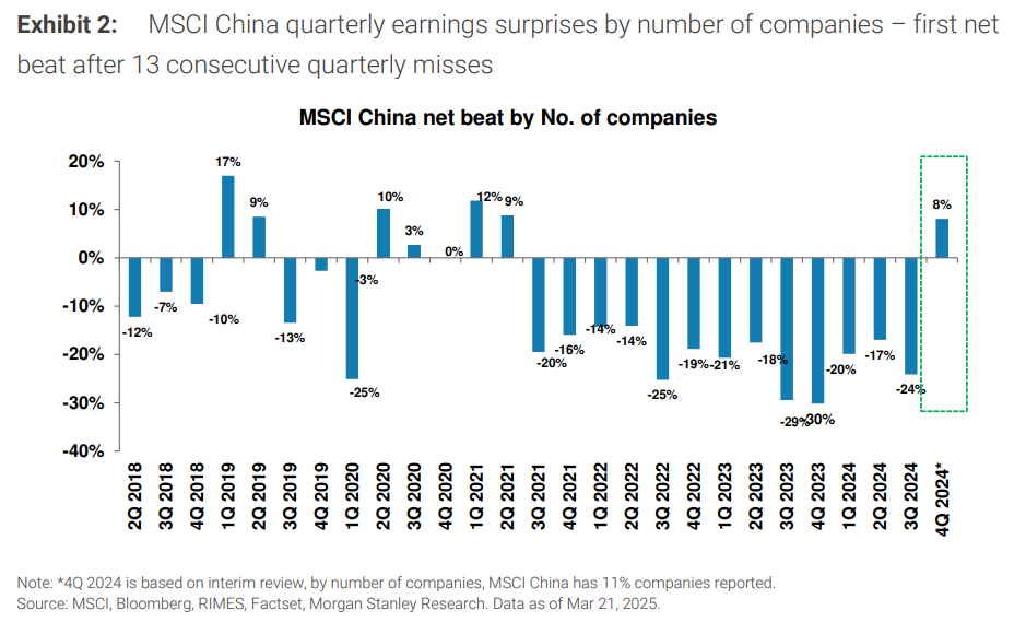 根据摩托车的数据,MSCI中国指数成份股在三年半以来的第一个季度业绩超出预期。截至目前,4Q24财务报告显示,根据公司数量计算,8%的净超预期是按市值加权计算的——这是2021年第三季度以来的第一次,结束了13个季度的业绩失望期。