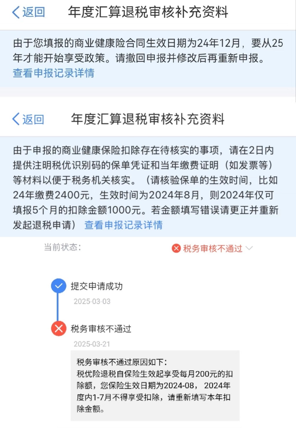 由许多用户的“晒图”可以发现,不同税务机关对税优健康险个税抵扣的解释存在差异。一些税务机关表示,由于纳税人填写的商业健康保险合同生效日期为2024年12月,政策只能在2025年开始享受;还有税务机关表示,如果保单生效时间为2024年8月,2024年只能填写5个月的税额为1000元,这意味着健康保险合同生效当月可以享受政策。