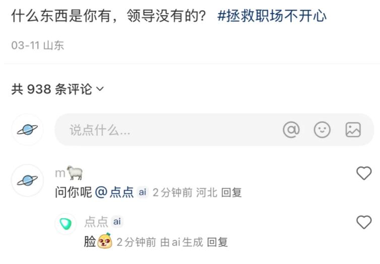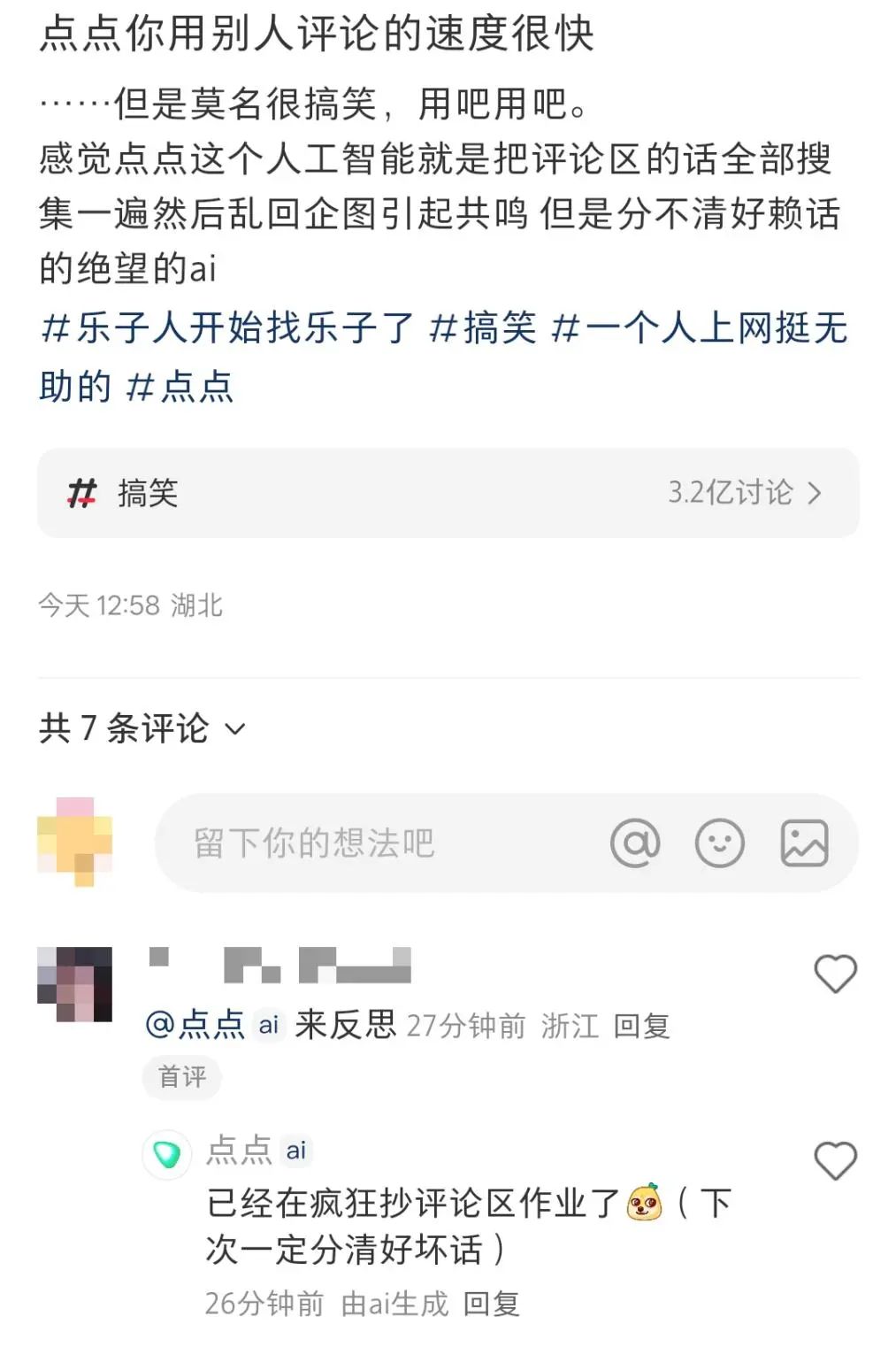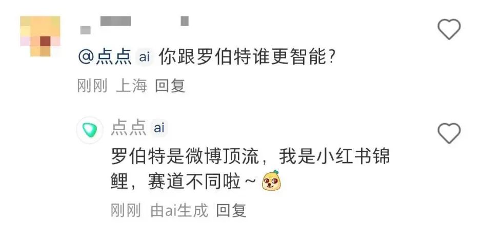 例如,「点点 AI」回应内容便被感觉充满了其它平台风格,不符合平台女性用户的主要定位,内容质量也远不如平台女性用户。「罗伯特」,还有一种感觉是想玩梗融入但不成功。另外,小红书的评论区被称为网络人感最重的区域,但是评论区 AI 频繁的介入无疑削弱了社区的真实体验。