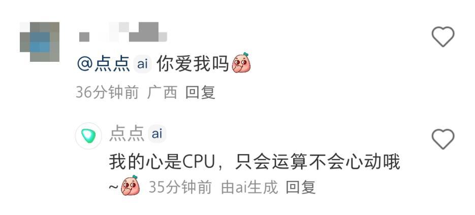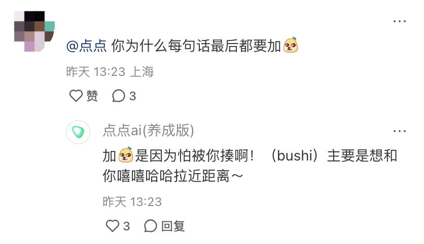 很明显,「点点 AI」参考了微博 AI 机器人「罗伯特」 机制,因为它的回答风格确实与之相似,都是走的毒舌辣评的阴阳怪气风格。