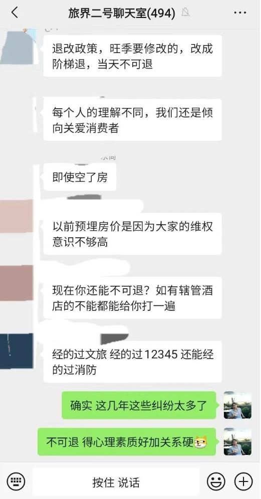 在某城市酒店老板所在的微信群聊中,有人建议客房退房改革政策的旺季要改成台阶退房,至少当天是不可退房的,多留几天取消预订收费窗口,或者统筹协调酒店剩余住房状况。