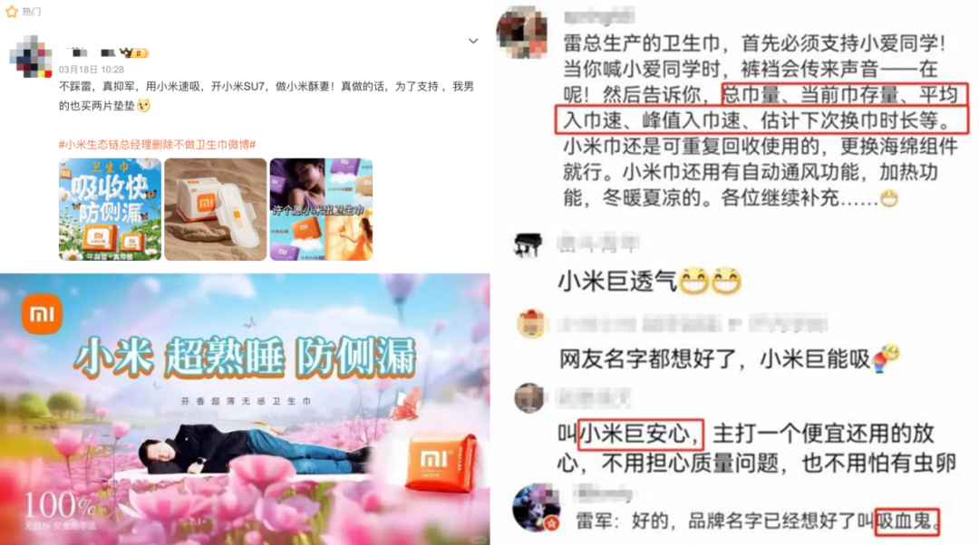 315晚会后,焦虑的客户把雷军微博评论区当成了许愿池,祈祷小米结局,做小米卫生巾,甚至有网友给小米卫生巾取名“小米巨能吸”。