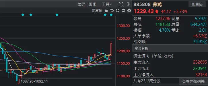 正如标题所说,养鸡板块(养殖业)日内大幅上涨,年内表现正好由跌转涨。
