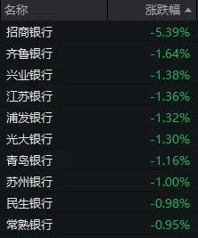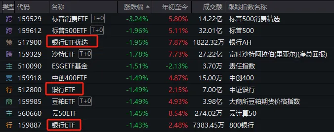 在现场ETF方面,今天很多银行主题ETF很少领跌,比如跟踪CSI指数银行ETF,成份股几乎全绿,其中最大的权重股——招商银行最为显眼,暴跌5.39%。