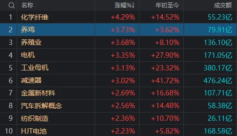 板块方面,化纤、养鸡、工业母机、光伏设备等板块涨幅居前,油气、银行、煤炭、电力等板块跌幅居前。