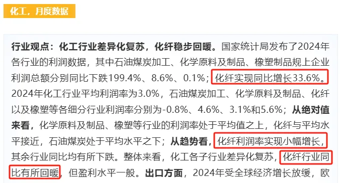 从基本面来看,兴业研究此前发布的2025年2月化工行业月度报告显示,化工行业多元化复苏,化纤稳步复苏。