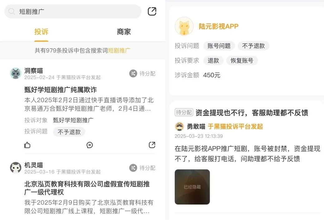 在黑猫投诉平台上搜索关键词“短剧推广”,发现近千条投诉,其中相当一部分直接指出“培训内容虚假广告”、“视频没有流量”、“没有赚到钱”。