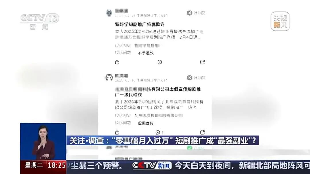 3月25日晚,央视新闻频道报道“短剧骗术”乱象,报道称“零基础月薪过万”短剧被推广为“最强副业”?其实是骗术!