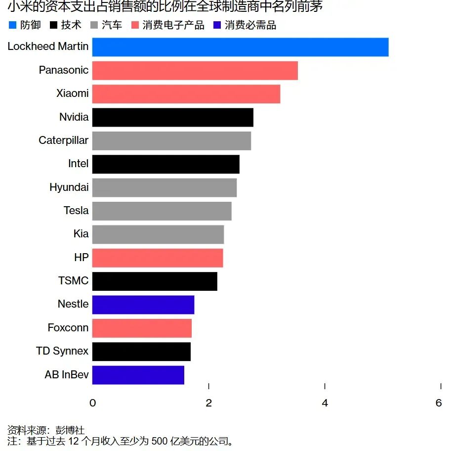 这更好地反映了小米的产品开发模式。虽然它有时被视为轻资产企业,更依赖广告和在线服务销售而不是实体设备,但它实际上是最积极的投资者之一。与数据相比,在彭博社36家全球大型制造商中,只有洛克希德・与小米相比,马丁公司和松下控股公司的投资更大。