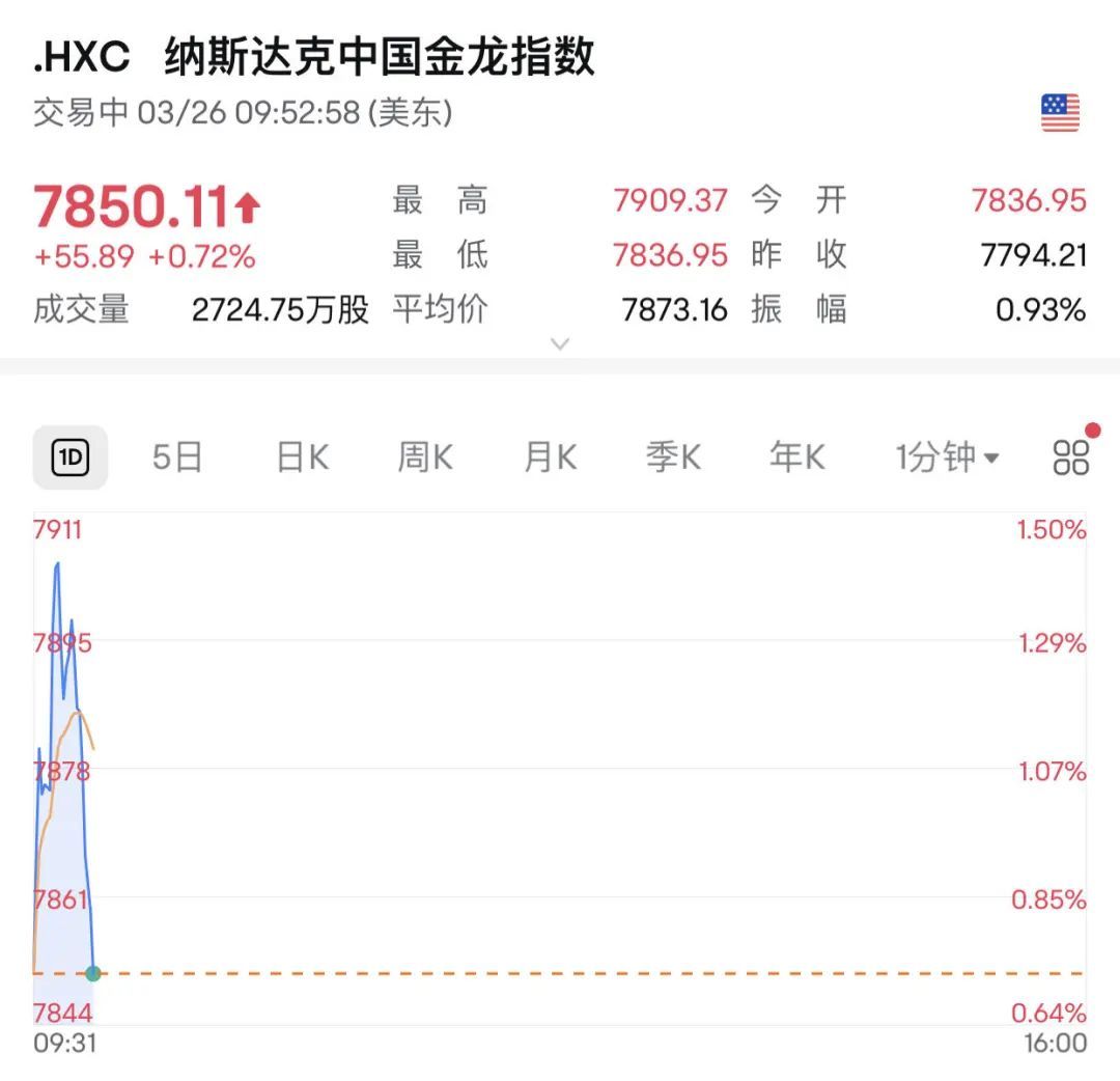 中国纳斯达克金龙指数开盘萎缩,截至发稿时,该指数上涨0.72%。