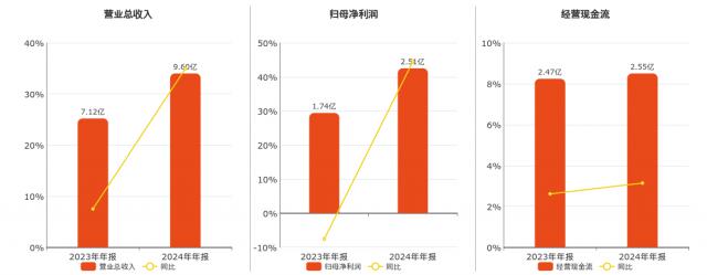 企业总营业收入为 9.60 亿元。归母净利润为 2.51 十亿元。经营活动现金净流入 2.55 亿元。