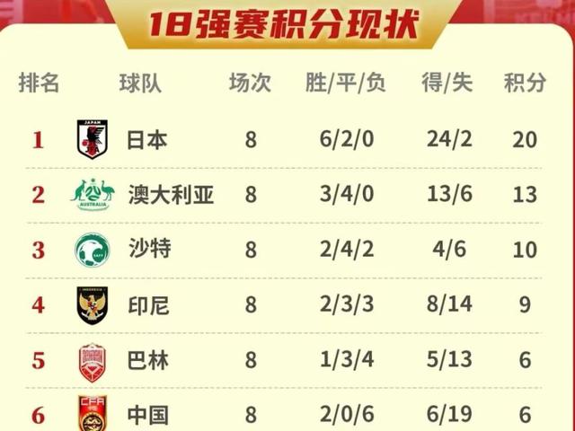 先来看看 C 小组排名,日本队 20 排在小组第一,已经提前晋升世界杯,事实上,日本队是世界上第一支晋升世界杯决赛圈的球队,除了主办国之外。澳大利亚积 13 排名小组第二,净胜球。 7 个人,已经提前两轮保证了小组第四名,锁定了参加下一阶段世预赛的资格。如果澳大利亚能在下一轮主场击败日本,可以提前一轮直达世界杯,否则要看其他比赛的结果;沙特的积累 10 排名小组第三,净胜球负。 2 个,印尼队积累 9 小组排名第四,净胜球负。 6 个,巴林队积 6 小组排名第五,净胜球负。 8 个,国足积 6 排名小组第六,净胜球负。 13 个。